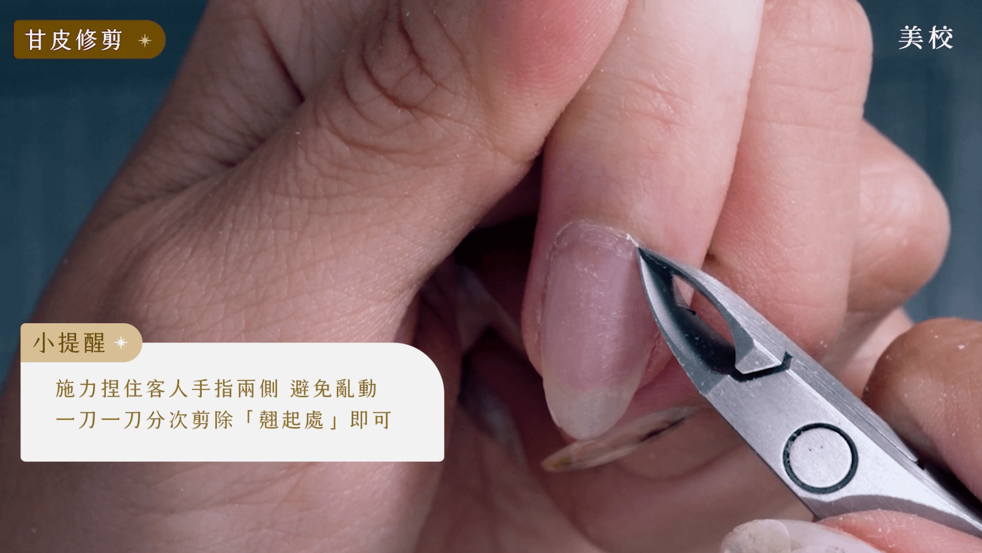 在修剪甘皮時,不用追求要一刀剪到底, 可以一刀一刀的把翹起來的甘皮剪掉, 確保修剪的平順就好,也不需要過度剪到根部太深入的地方,會非常容易剪破流血,只需要把翹起來的地方修剪乾淨即可,如果在過程中刀口積了太多甘皮,也可以先清理一下再繼續修剪。