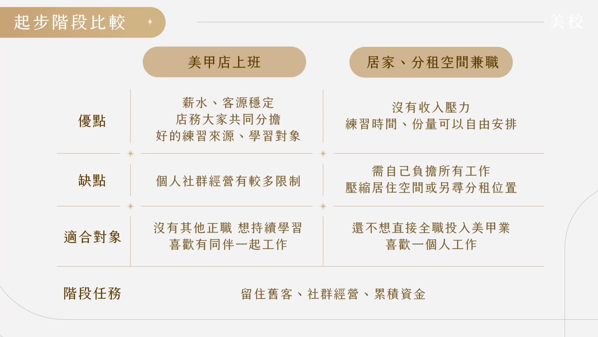到美甲店上班的優點是你不需要煩惱客源,剛成為職業美甲師的初期,客源是一個相當重要卻也比較難在前期就很穩定充足的,因此如果你擔心剛開始沒辦法有足夠的客人上門,可以考慮先到美甲店上班,但同時就也會需要配合店內的規定,有時候會需要支援一些店務或與經營有關的事項。