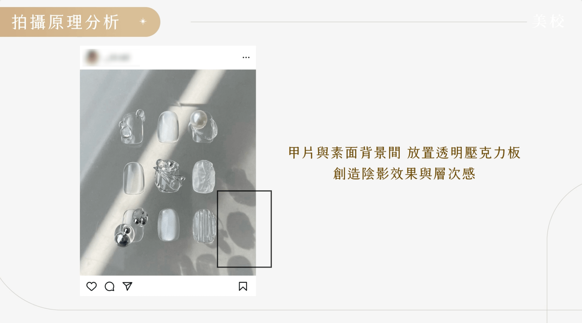 現在的社群媒體很興盛,IG、小紅書有很多自媒體都會分享美甲的技術知識,由於一部分是現在就在在當美甲師的人分享的,在風格、工具運用和技巧上,也確實會比較貼近沙龍實務一點。